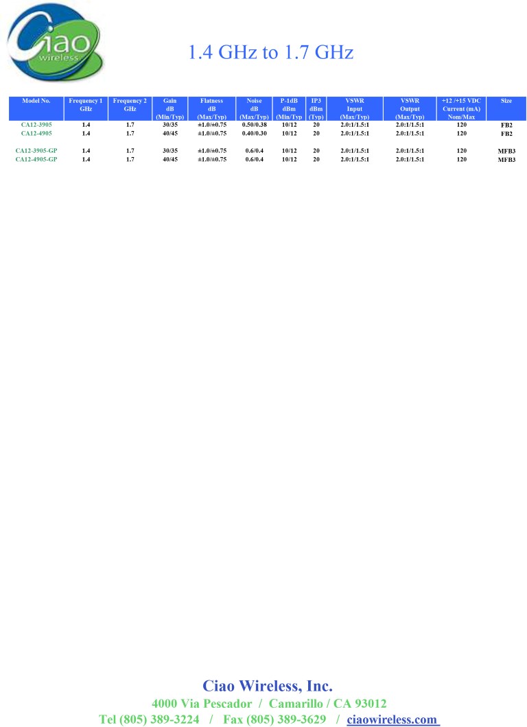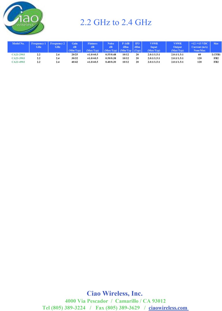Want Us To Contact You? We will be in touch shortly. Ultra Low Noise Amplifiers Starting at 1.0 GHz 1.0 – 1.3 GHz 1.2 – 1.5 GHz 1.4 – 1.7 GHz 1.6 – 1.9 GHz 1.7 -2.1 GHz Starting at 2.0 GHz 2.0 – 2.2 GHz 2.2 – 2.4 GHz 2.5 – 2.7 GHz 2.7 – 2.9 GHz 2.7 – 3.1 GHz 2.9 – 3.1 GHz High Performance. Innovative. Reliable. Ciao Wireless is ISO 9001:2015 and AS9100:2016 Certified Request a Quote